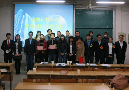 通过前期简历筛选,共十名同学顺利晋级当晚的决赛。决赛分为应聘演讲、评委提问和无领导小组讨论等三个环节。选手们激情的应聘演讲、精彩的答辩,尤其是无领导小组讨论中,选手们快速的临场反应、缜密的逻辑思维和团结协作的团队精神,赢得了现场观众的阵阵掌声,同时让场下低年级学生对职场新人应该具备的特质有了较为直观的认识。最终,来自2010级动物医学专业的李梦琦获得一等奖。